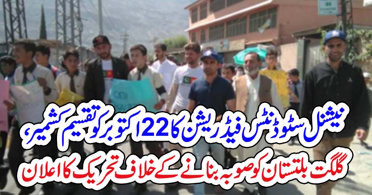 راولاکوٹ (نمائندہ خصوصی ) جموں وکشمیر نیشنل سٹوڈنٹس فیڈریشن نے22ا کتوبر کو تقسیم کشمیر ،گلگت بلتستان کو صوبہ بنانے کے خلاف تحریک کا اعلان کرتے ہوئے ــ’’نیشنل یونٹی مارچ‘ لائن آف کنڑول تتری نوٹ کراسنگ پوائنٹ کی جانب لانگ مارچ کا اعلان کر دیا ، لانگ مارچ کا مقصد قابض قوتوں کو یہ پیغام دینا ہے کہ ہم کسی بھی تقسیم کے ایجنڈے اور سرحد کو تسلیم نہیں کریں گئے،